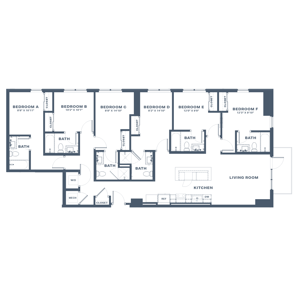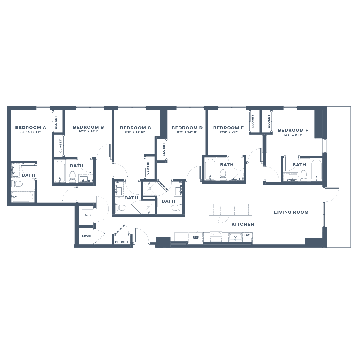 Do it all in The Crescent, one of Rambler’s six-bedroom floor plans. This oversized apartment has enough space for you and five of your best friends to catch a game in the living room or get some peace and quiet in each of your own bedrooms with ensuite baths. This blend of luxury and style will become the perfect backdrop for some of your best memories.