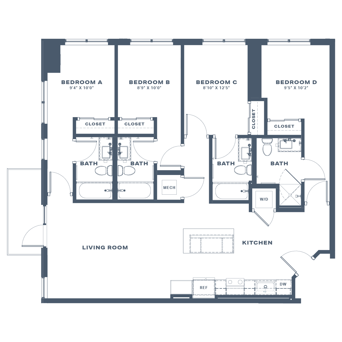 Grab three of your best friends and look no further than The Pearl, Rambler’s largest four-bedroom floor plan. This corner unit offers plenty of natural light for a bright and airy apartment feel.